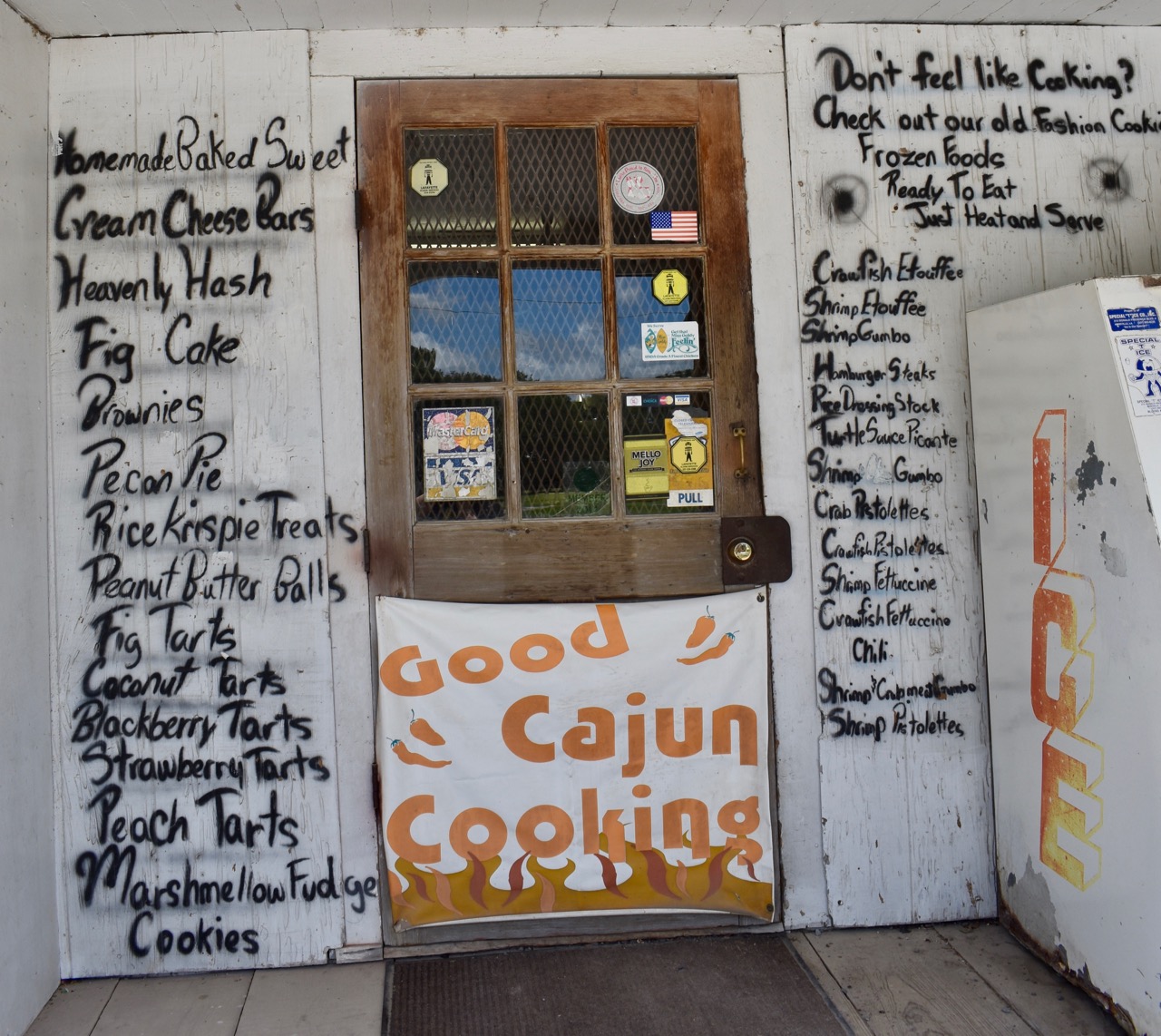 You know it’s going to be a memorable experience instead of a quick bite right when you pull up to the unassuming white building. The menu is painted on the outside, along with a faded but very friendly-looking alligator to welcome you.