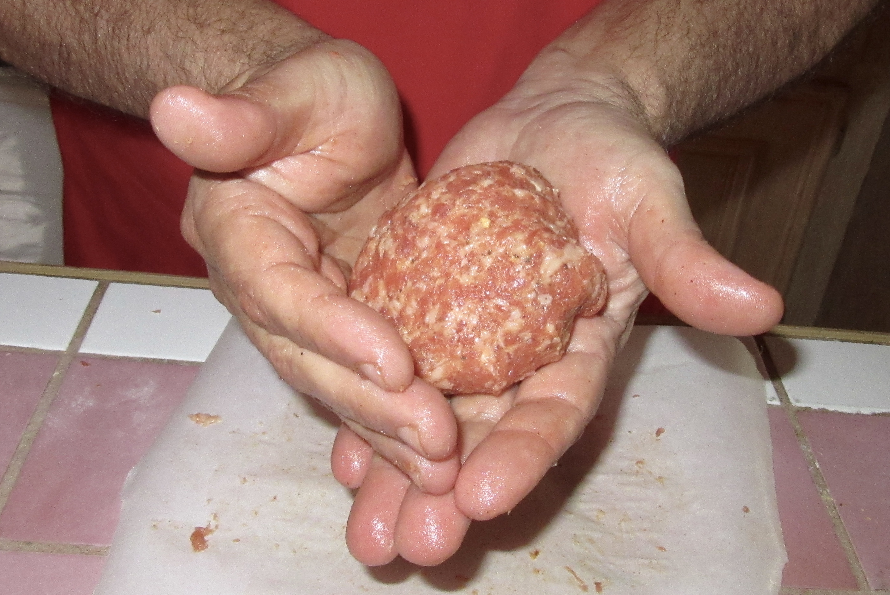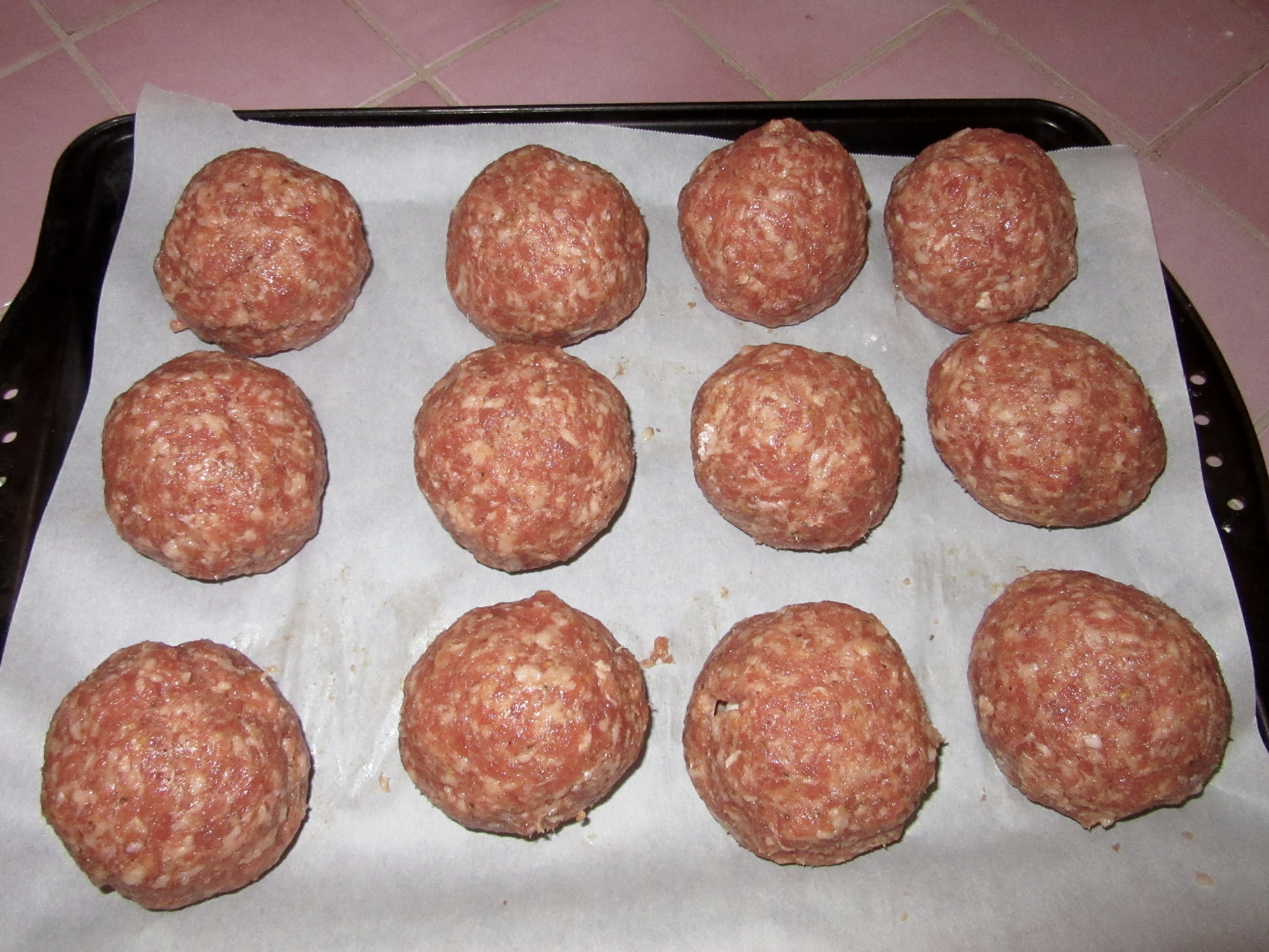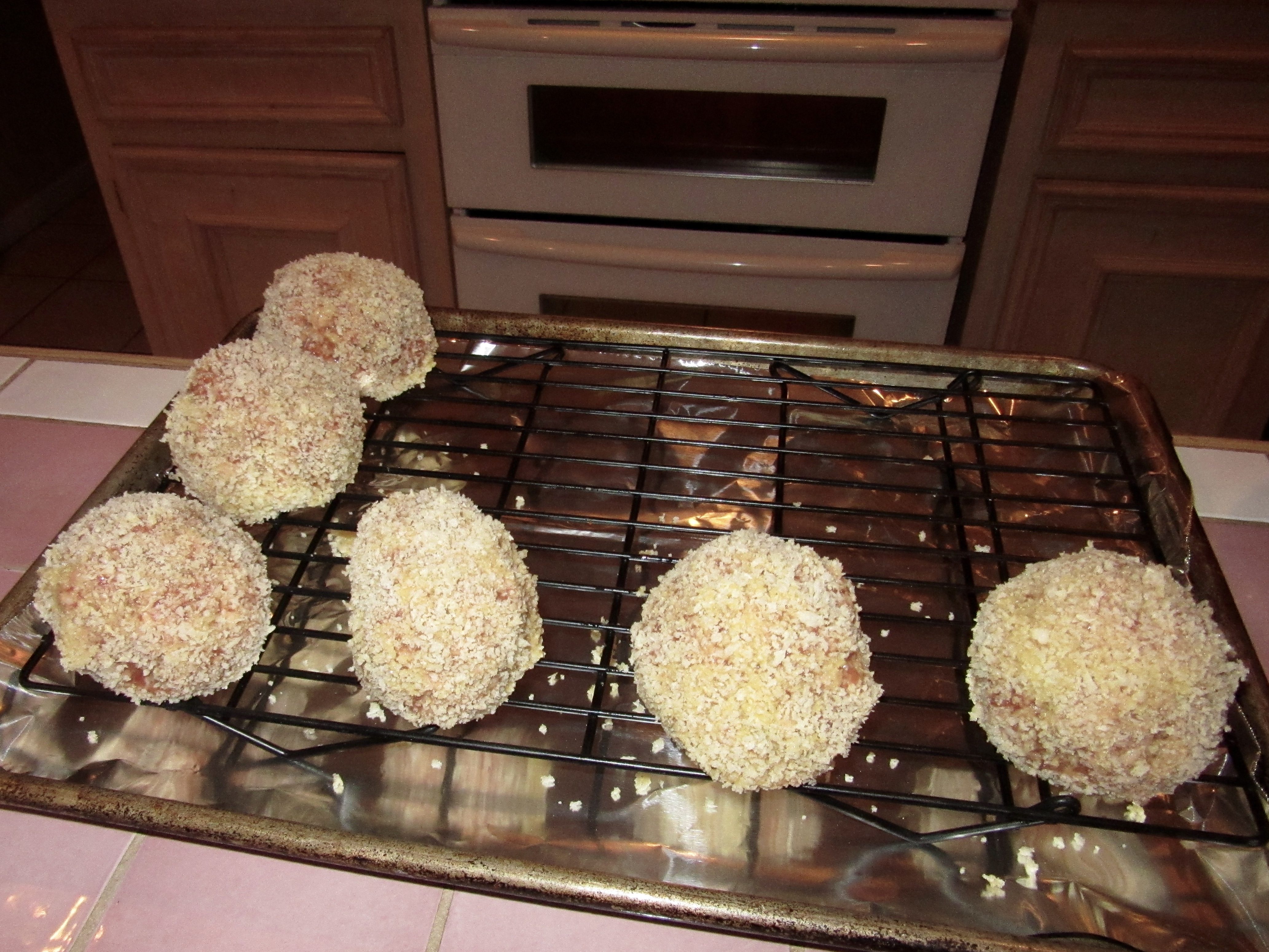 The Grill-Meister is smart, and decided to translate Betty’s recipe into a make-ahead dish so that it wouldn’t be a big chore on Christmas. He also decided to use a baking rack so that the Scotch Eggs wouldn’t sit in the sausage drippings.