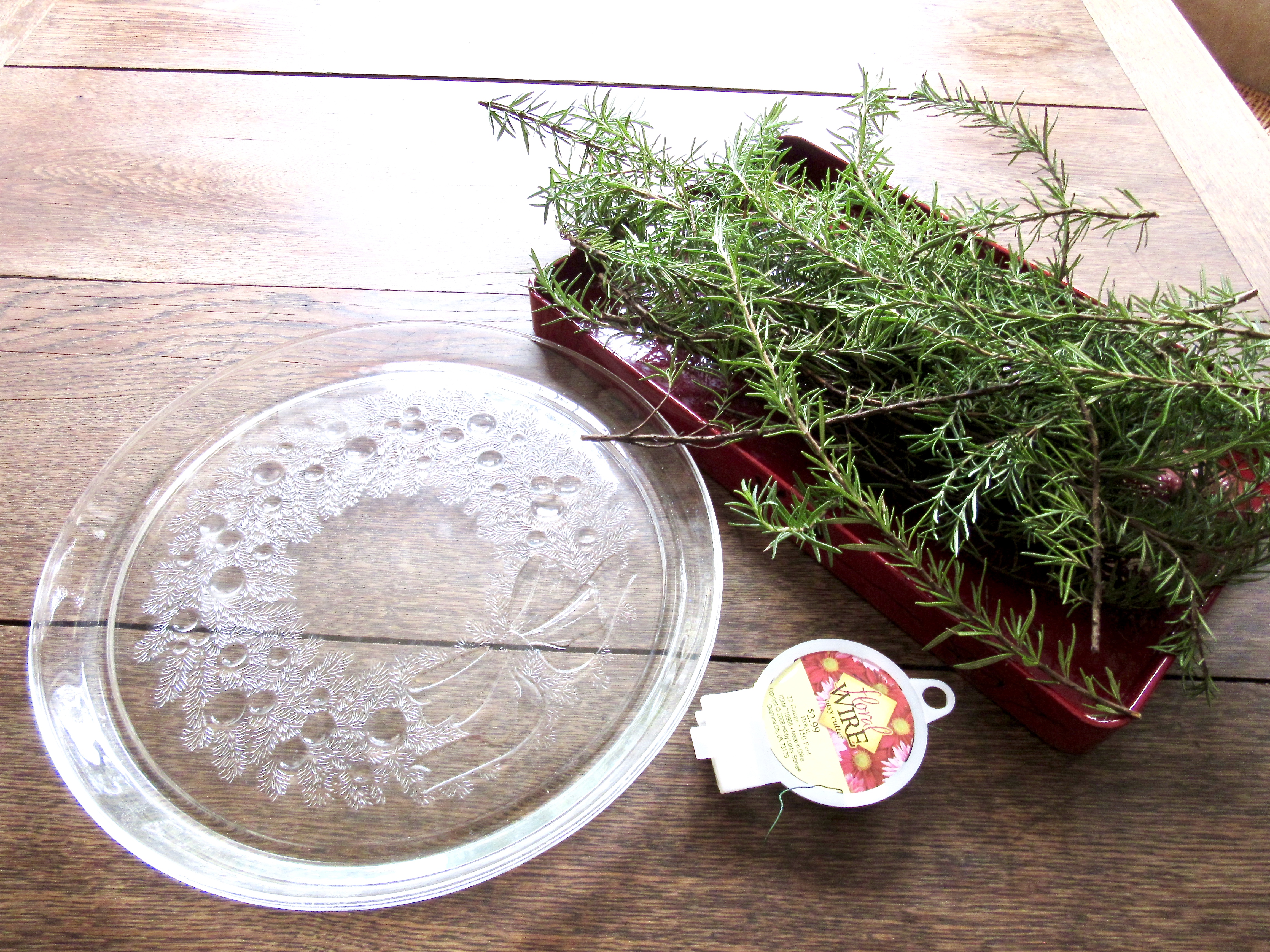 Snip about 30 sprigs of rosemary, about 8″ – 10″ inches long. Remove the side sprigs so that each length of rosemary is only one stem. Lay the longer sprigs in a circle on a round platter and secure with florist’s wire. Tuck the shorter ones in around the circle to even out the wreath.