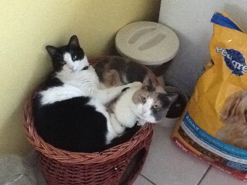This week’s photo challenge from The Daily Post is about variations on a theme – any photo(s), any theme, any variation. An easy one for me is our feline family members. So, for your cat-picture-viewing-pleasure, here are variations on the theme of feline togetherness at Glover Gardens, Fiona and Godfrey in various poses, with a little haiku to close it out.